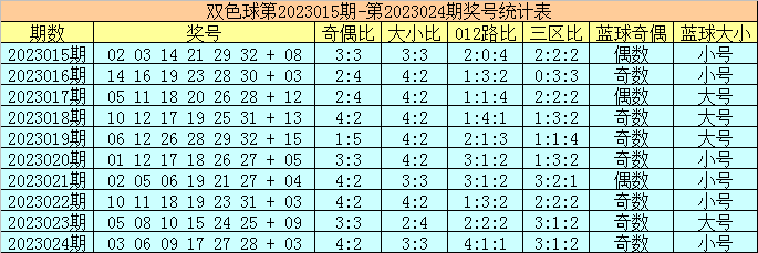 上期开奖:双色球第2023024期开出奖号03 06 09 17 27 28 + 03皇冠投注app,其中红球奖号奇偶比为4:2,大小比为3:3,012路比为4:1:1,三区比为3:1:2,蓝球开出:奇数、小号。