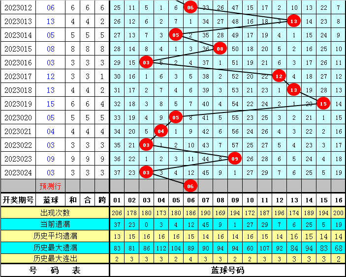 蓝球号码分析:最近10期蓝球号码奇偶比为7:3,大小比为4:6,最近5期蓝球大小比为4:1,大小比为1:4,本期关心偶数、小号蓝球开出,关心蓝球号码06。