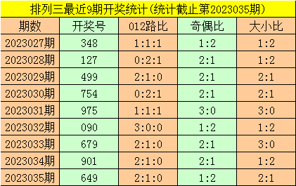 二、体彩胪列三前9期奖号开出:348-127-499-754-975-090-679-901-649,其中奖号大小比为16:11,012路比为13:10:4,奇偶比为16:11;