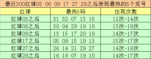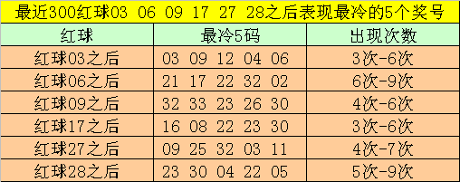 红球冷码统计:双色球第2023024期开出红球奖号离别为:03、06、09、17、27、28,在最近300期开奖中,各号码出现之后其下期出现最少的5个红球离别为: