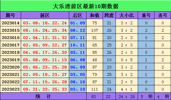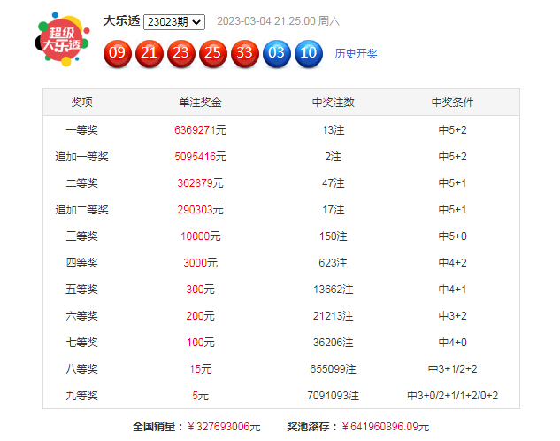 大乐透第23023期开奖。当期开奖号码为:前区09 21 23 25 33,后区03 10。当期前区号码大小比为4:1,奇偶比为5:0,三区比1:2:2,后区开出小大组合03 10